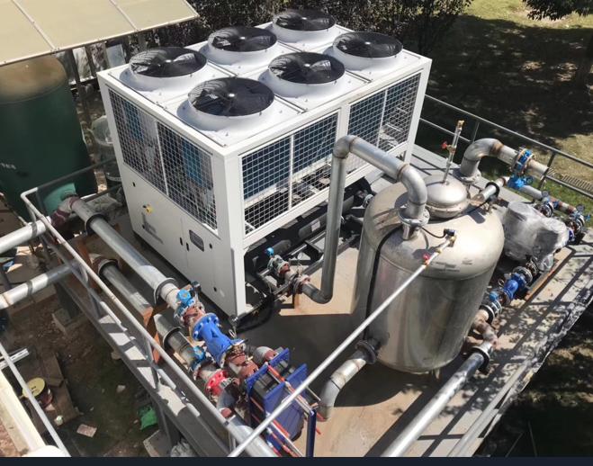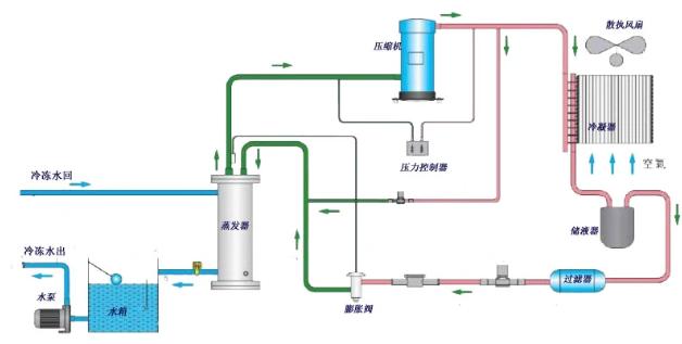 當空氣冷卻式制冷機啟動時,制冷劑吸收蒸發(fā)器中被冷卻物體的熱量并蒸發(fā)。壓縮機不斷地從蒸發(fā)器中提取產(chǎn)生的氣體,并將其壓縮成高溫高壓蒸汽。然后,制冷劑蒸汽被送往冷凝器,在那里與空氣進行熱交換。釋放熱量后,它凝結成液體。液體制冷劑在被膨脹閥減壓后,進入蒸發(fā)器,在那里再次蒸發(fā),吸收冷卻物體的熱量。重復該熱交換過程,直到工業(yè)用水冷卻到所需溫度。